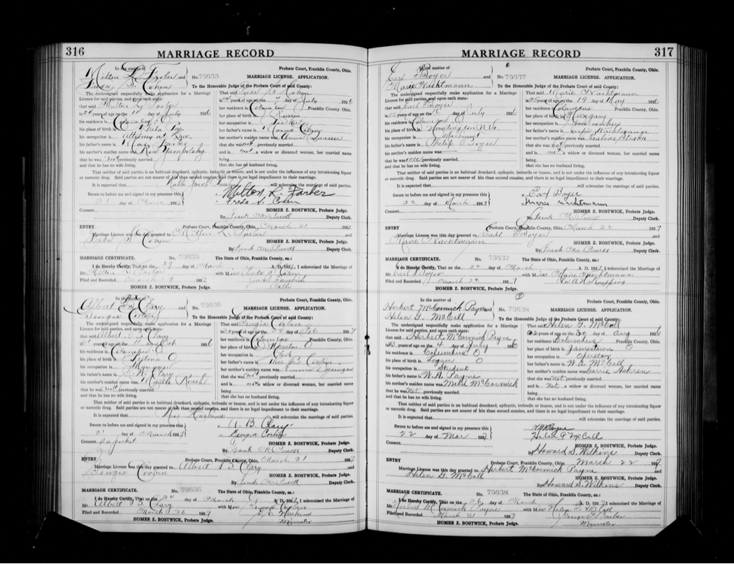 Marie married Earl Phillip Boyer (Bowyer) in 1927 in Franklin County, Ohio. They had two children, Maxine (1931) and Erwin (1934). They divorced shortly after and Earl passed away of cirrhosis of the liver in 1946 at the age of 45. She continued to include him in her prayers. She also endured the death of her parents in 1941 and her close cousin, Robert Rankel, in 1944. Robert survived the bombing of Dresden after being buried in rubble for 3 days. The cause of his death is unknown, Letters indicate that he wanted to come to America but was unable to when immigration was halted.